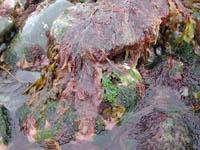 Thallus is light pink, variable in shape, and can reach more than 100 cm (39 in) in length. It is very thin although it is actually two cell layers thick (distromatic). The margin of the blade often appears filmy because of scattered reproductive cells. Habitat: This species is often found on clam shells on sandy beaches at low tide in spring and early summer; it can also grow on rock. Similar taxa: Porphyra variegata, another distromatic species, is thicker, and the blade is sectored into separate male and female halves.